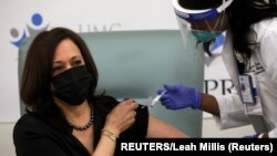 COVID 19 ရောဂါ ဖြစ်ပွား ကူးစက်မှုတွေမြင့်တက်နေတဲ့ အမေရိကန်ပြည်ထောင်စုမှာ ကာကွယ်ဆေး ထိုးနှံပေးတဲ့ အစီအစဉ်ကို ဆက်လက်လုပ်ဆောင်နေချိန်မှာပဲ ရွေးကောက်ခံ ဒုတိယသမ္မတ Kamala Harris နဲ့ သူ့အမျိုးသား Doug Emhoff တို့ အင်္ဂါနေ့က ကိုဗစ် ကာကွယ်ဆေး ထိုးခဲ့ပါတယ်။