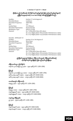 ဗွီအိုအေမြန်မာပိုင်း အသံလွှင့်အစီအစဉ်ကနေ နောက်ဆုံးရ ကမ္ဘာနဲ့ မြန်မာသတင်းတွေ၊ သတင်းဆောင်းပါး၊ သုံးသပ်ချက်နဲ့ ဗဟုသုတရဖွယ် ကဏ္ဍစုံကို တနေ့ကို (၅) ကြိမ် ထုတ်လွှင့်ပေးနေတာကို ဗွီအိုအေ မြန်မာပိုင်း ရေဒီယိုအစီအစဉ်တွေမှာ နားဆင်နိုင်ပါတယ်။ မနက်ပိုင်း အစီအစဉ်တွေကို မြန်မာစံတော်ချိန် မနက် (၆) နာရီကနေ (၇) နာရီ၊ ညနေအစောပိုင်း အစီအစဉ်တွေကို ညနေ (၆) နာရီခွဲကနေ (၇) နာရီ၊ ညပိုင်းအစီအစဉ်ကို ည (၉) နာရီကနေ (၁၀) နာရီအထိ နားဆင်ရမှာပါ။ မနက် (၇) နာရီ၊ (၈)နာရီနဲ့ ညပိုင်း (၁၀) နာရီမှာလည်း တကြိမ်စီ ပြန်လည် ထုတ်လွှင့်ပေးနေပါတယ်။